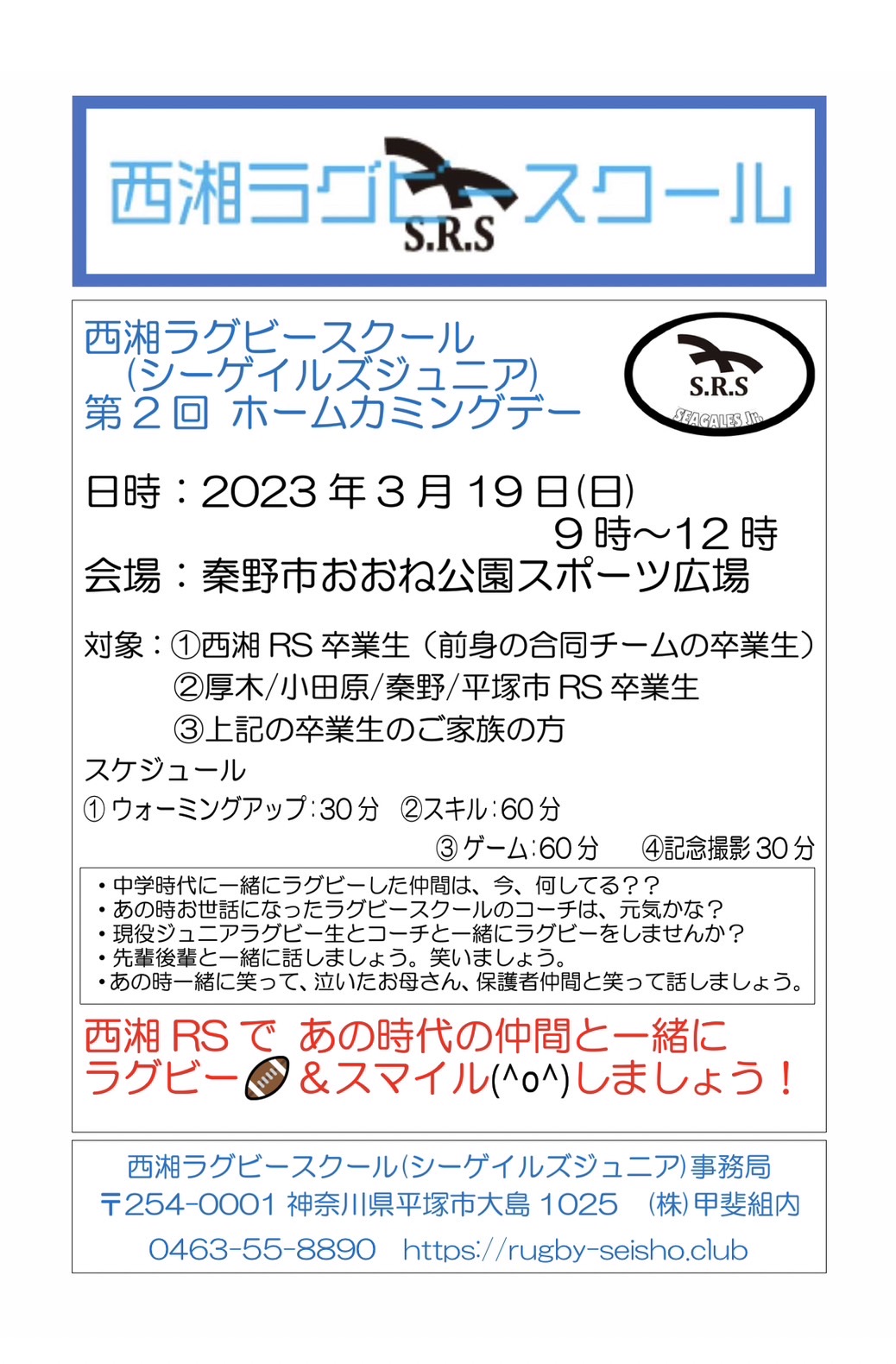 日時3月19日(日)9時〜12時会場秦野市おおね公園対象・西湘RSの卒業生と卒業生の保護者の方・前身の合同チームの卒業生と卒業生の保護者の方・厚木小田原秦野平塚市RSの卒業生と卒業生の保護者の方参加をお待ちしております。また、情報を拡散してください。今年度の卒業生と在校生とみんなでラグビーしましょう🏉みんなで笑いましょう😊よろしくお願いします。
